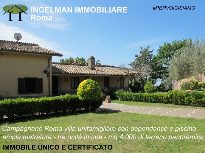 Affacciata sulle campagne romane con panorama mozzafiato a pochi minuti da Campagnano, immersa nel verde, unica nel suo genere, mq 543 di superfice residenziale con terreno di un ettaro e mezzo di cui 5000 mq destinati a giardino, in parte terrazzato, a servizio della casa.