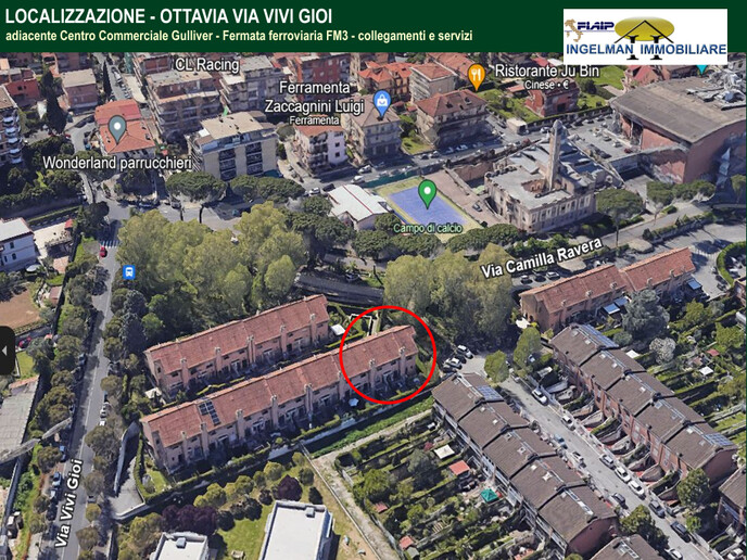 In zona centralissima adiacente al centro commerciale Gulliver - Fermata Ferroviaria FL3 che si collega con la Metro "A" - scuole - tutti i principali servizi a portata di mano - proponiamo la vendita di un villino con ampia consistenza e due giardini e box di circa mq 30. La villa si sviluppa su quattro livelli di cui 2 piani residenziali con una superficie totale box escluso di circa mq.140 commerciali(nell computo delle superfici si è tenuto conto dei locali accessori computati al 50%).
